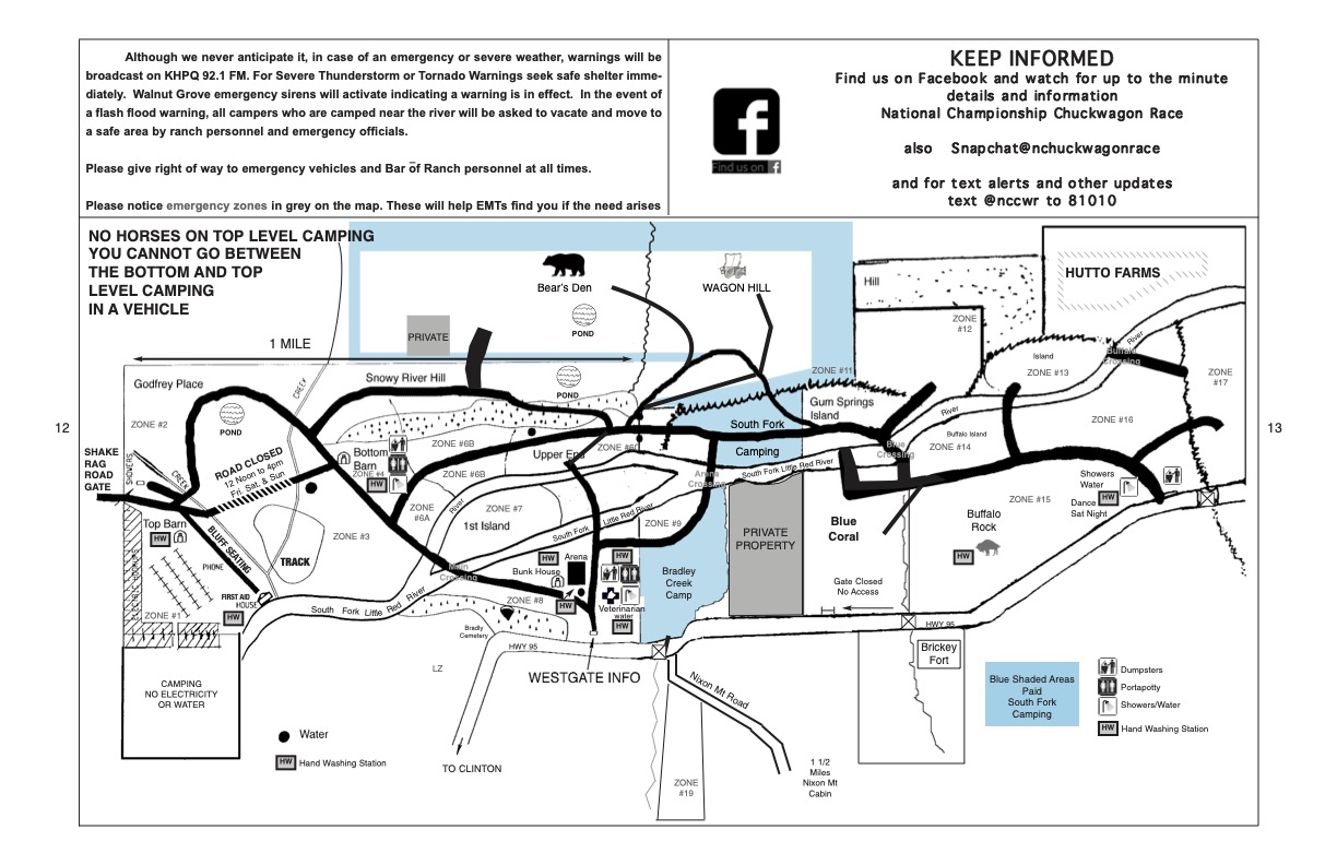 - Vehicles permitted only to get to the starting line and walk to the top after the performances and Saturday and Sunday mornings until 12:00 noon OR to get water and use the showers